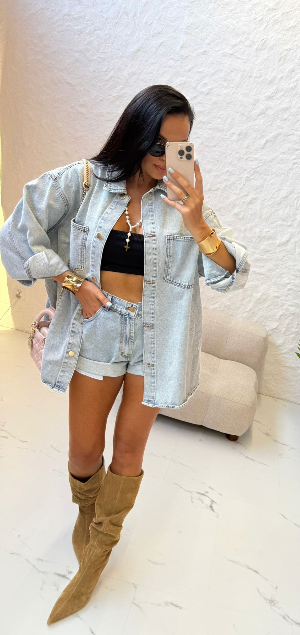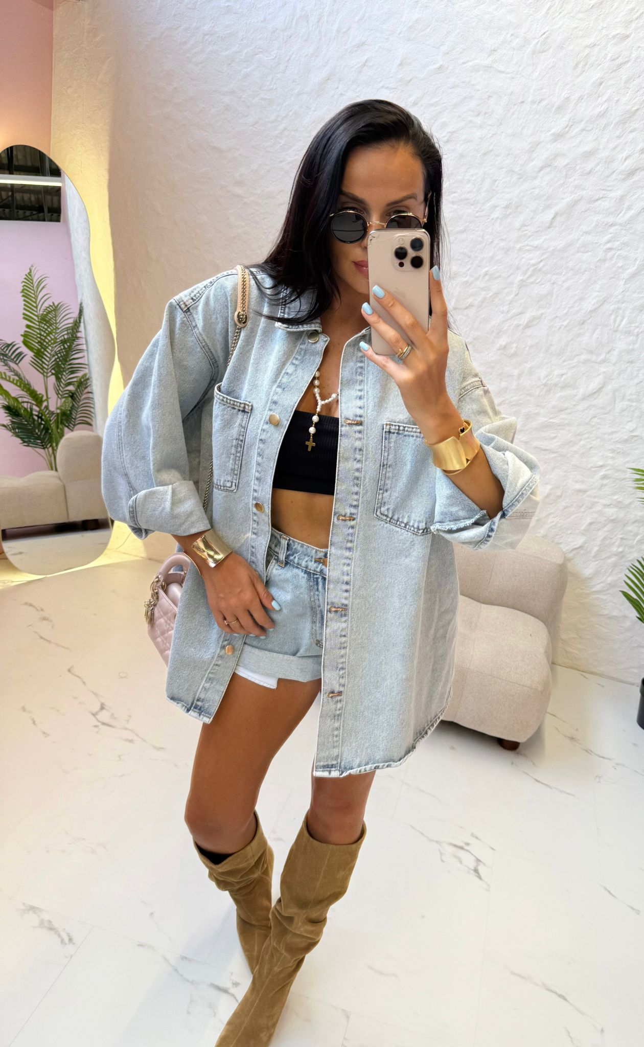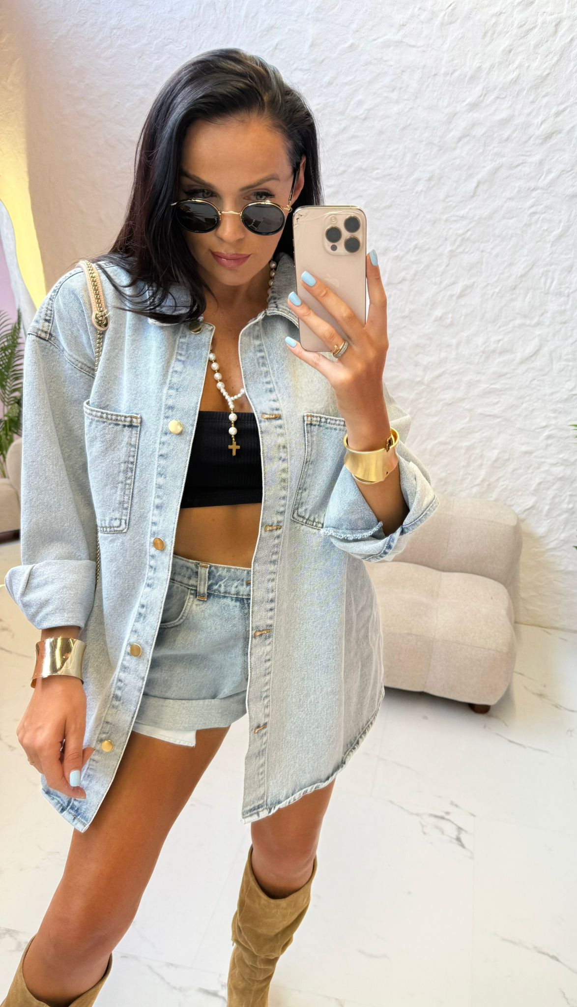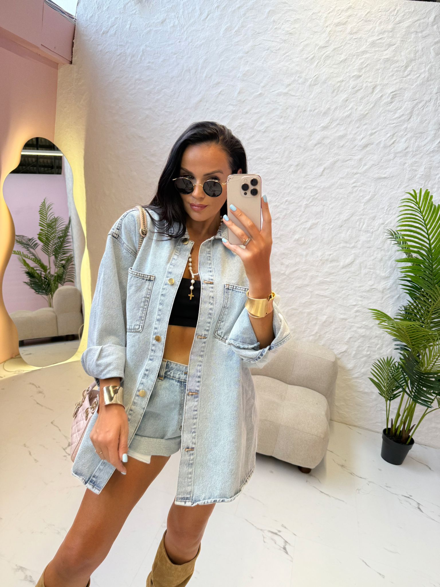 Koszula katana jeansowa polskiej firmy modowej La Milla. Uszyta z materiału denim. Zapinana na guziki. Fason dłuższy, idealna do krótkich szortów, które też znajdziesz u nas w butiku.
