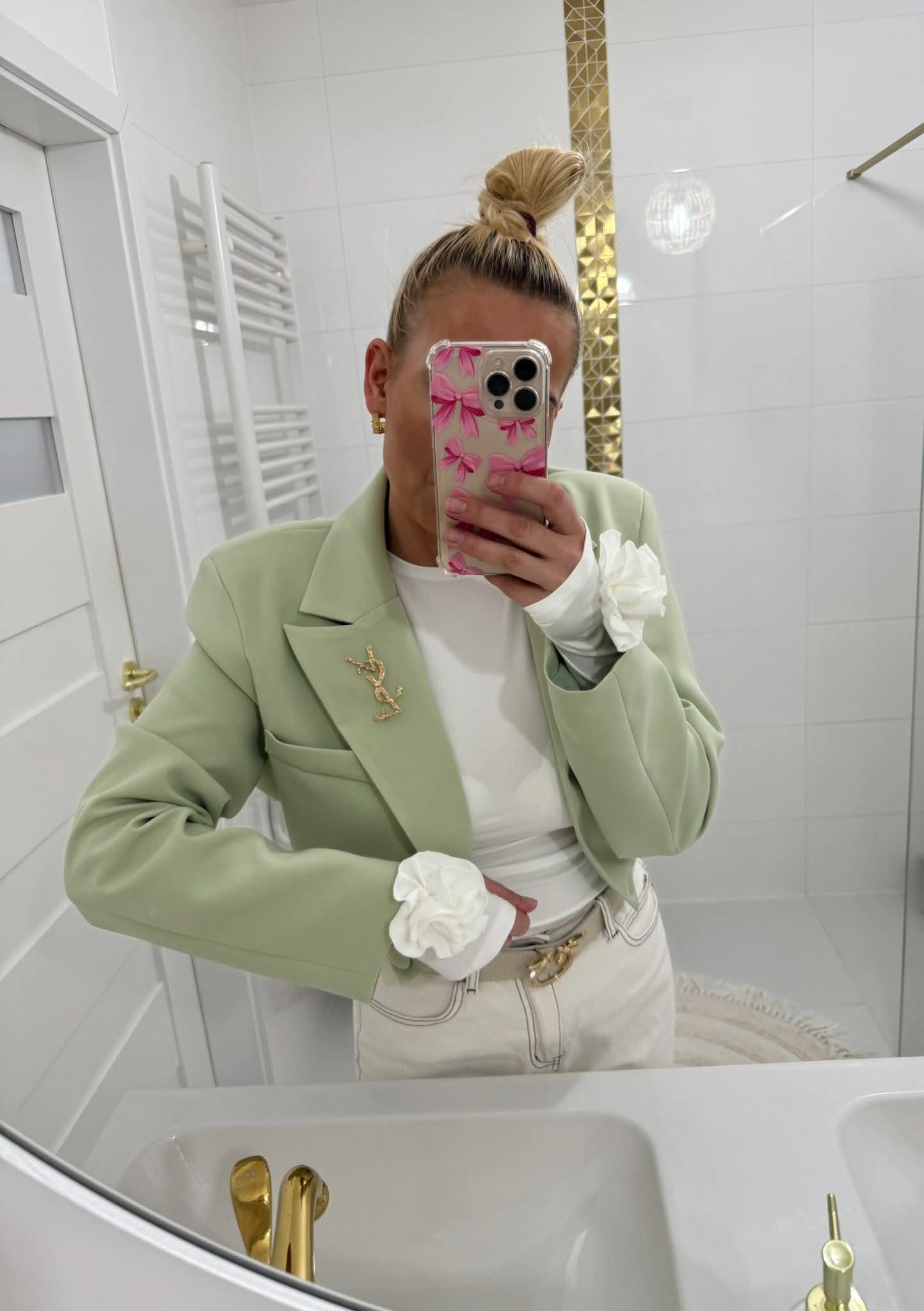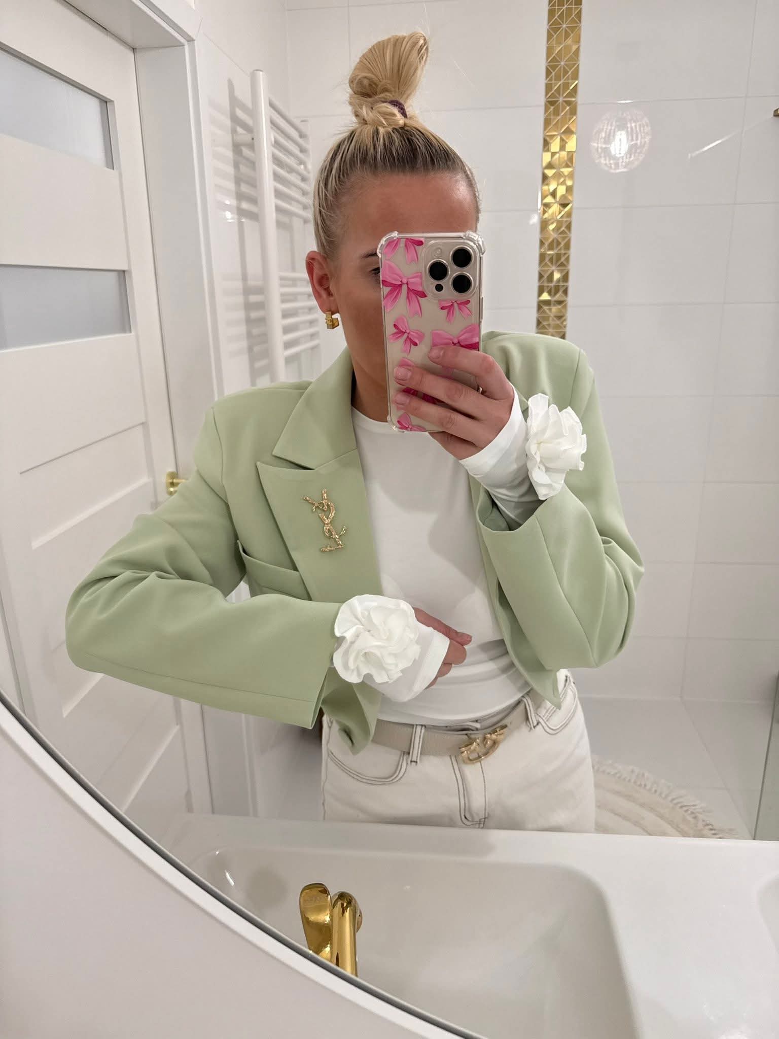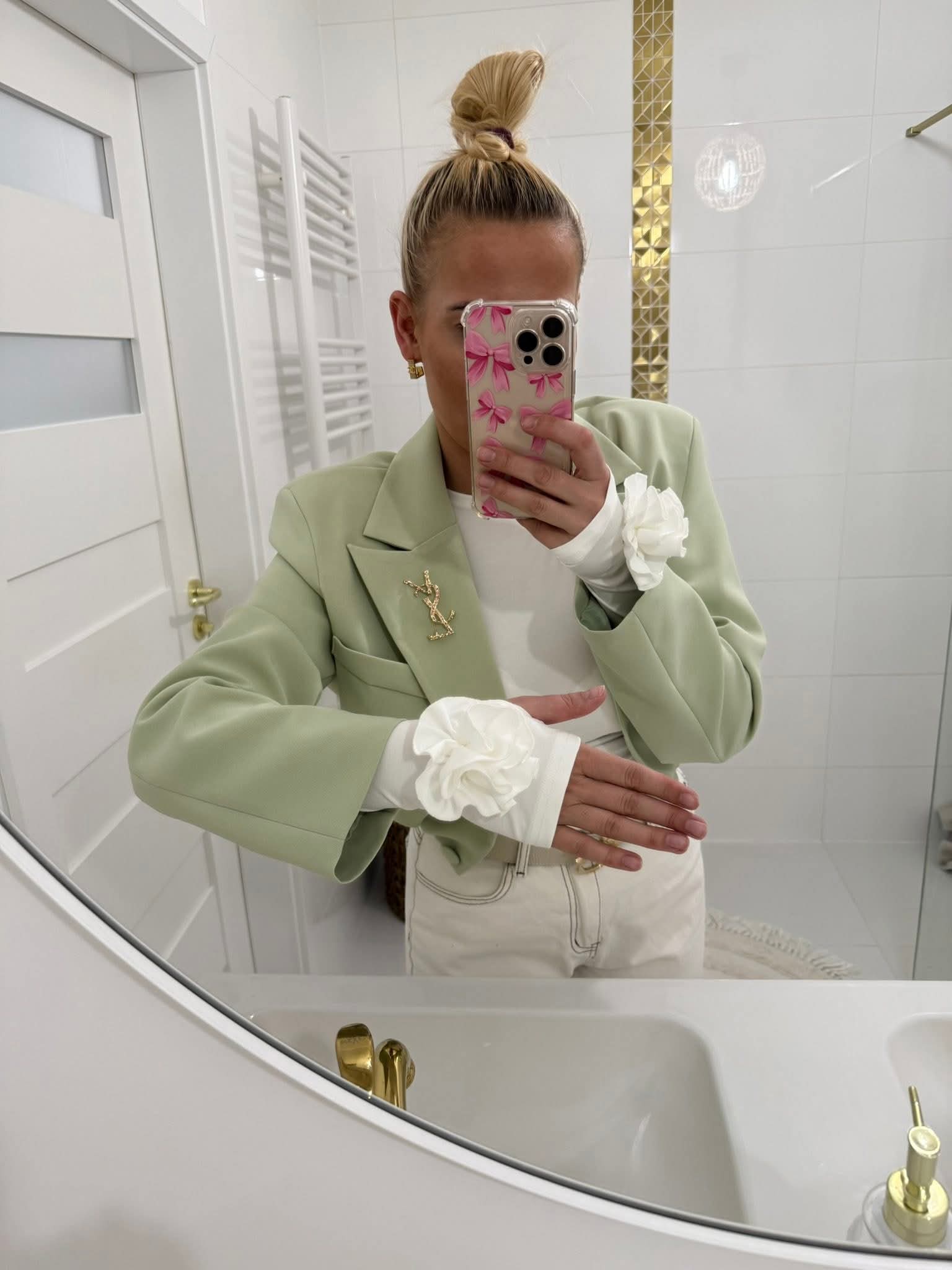 Marynarka bomberka to modna propozycja dla kobiet, które cenią połączenie elegancji i wygody. Krótszy fason pięknie podkreśla talię, a lekko zaokrąglony dół nadaje całości nowoczesnego, kobiecego charakteru. Model doskonale sprawdzi się zarówno w stylizacjach casualowych z jeansami, jak i bardziej eleganckich zestawach ze spodniami lub spódnicą.