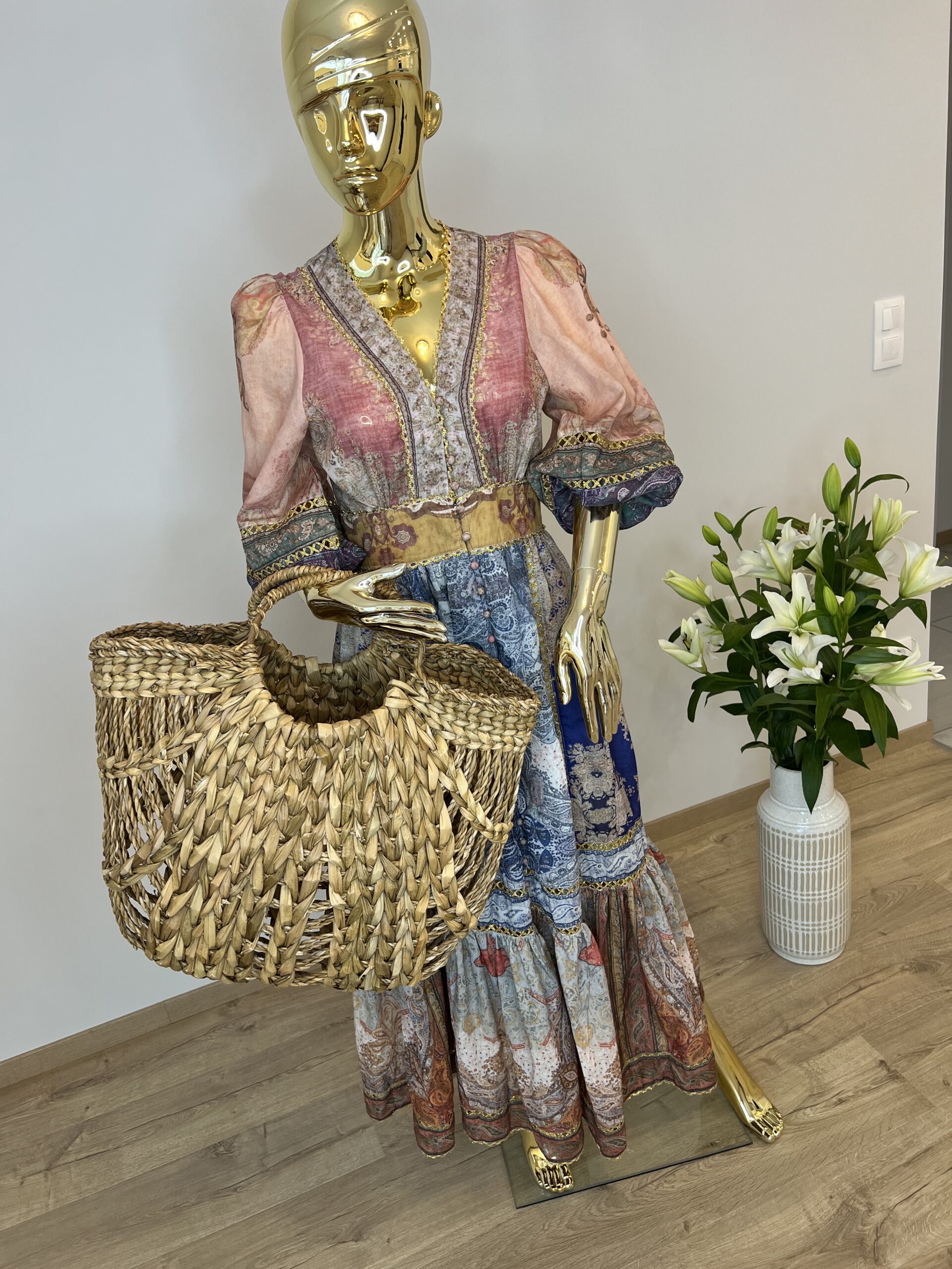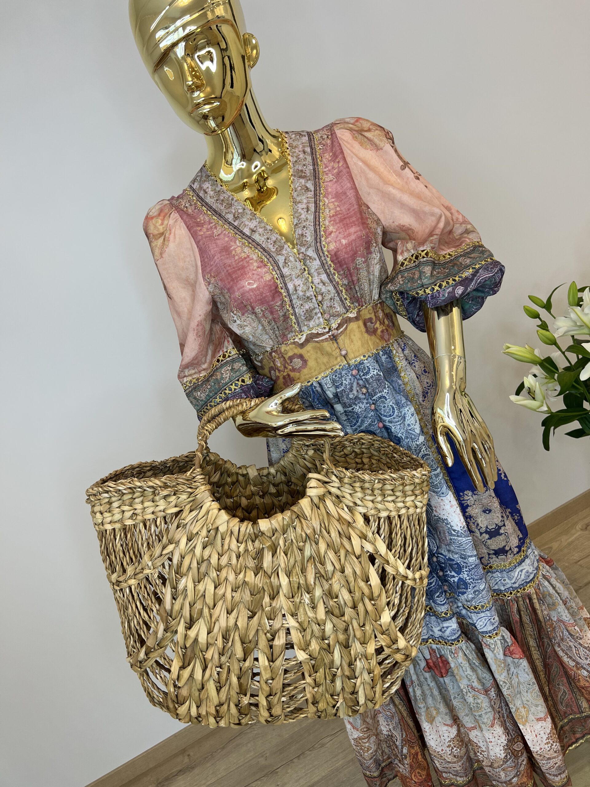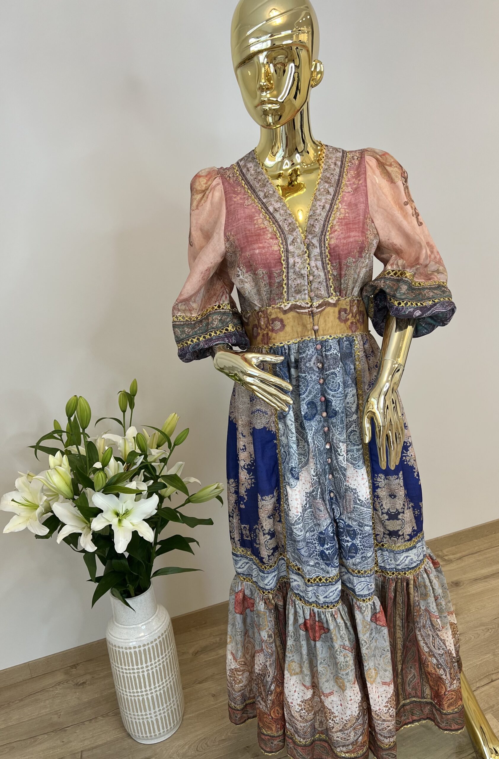 Rozkloszowana sukienka maxi z orientalnym printem San Diego idealnie sprawdzi się w letnich stylizacjach. Głęboki dekolt V przepięknie eksponuje linię biustu i podkreśla obojczyki, a także optycznie wydłuża szyję. Balonowe rękawy są wykończone gumką, dzięki czemu możesz regulować ich długość. Zwiewny krój oraz przewiewna tkanina, z której została wykonana sukienka, zapewniają wygodę noszenia, a ciekawe łączenia materiałów urozmaicają całość.