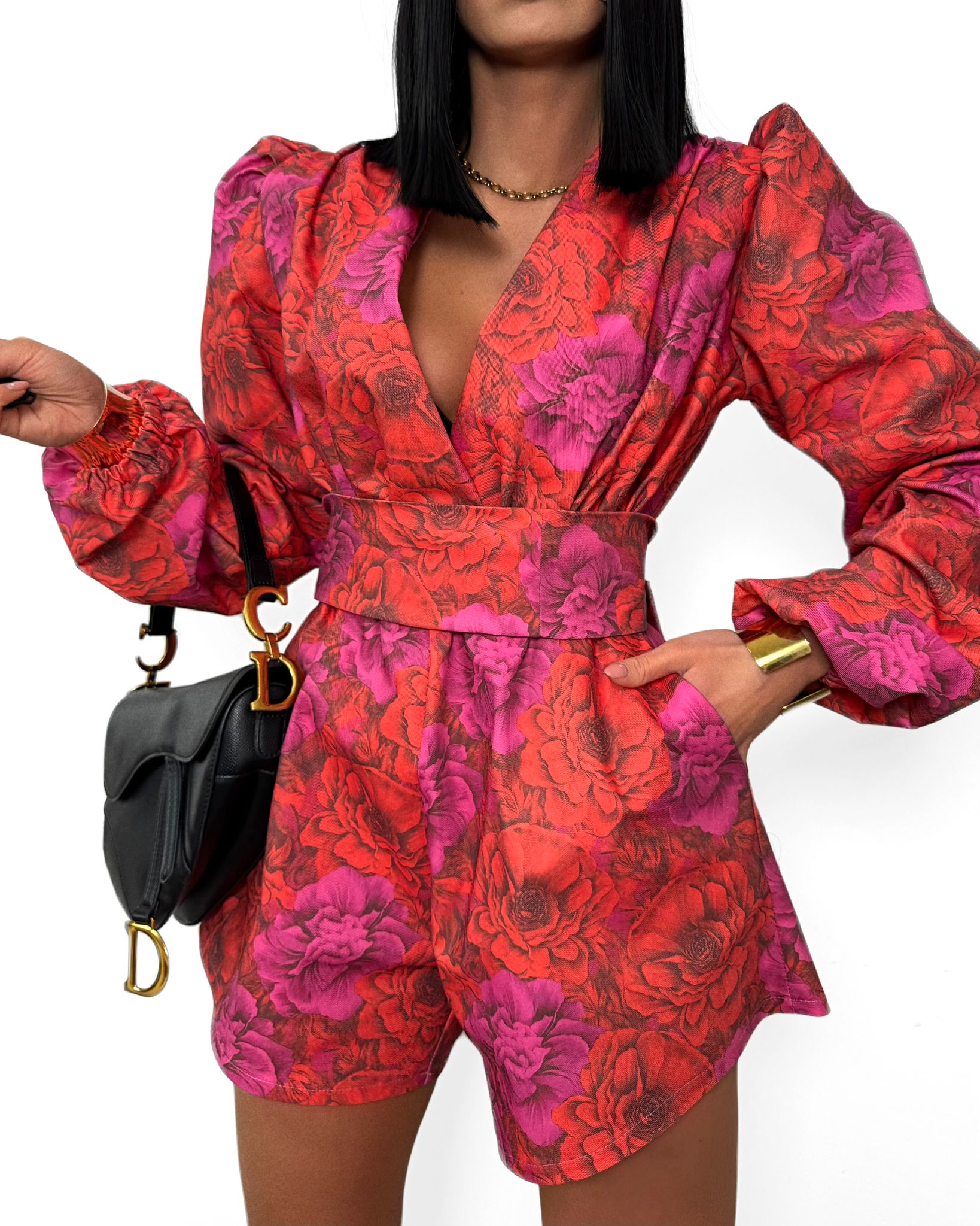 Kombinezon fantastycznie komponuje się z minimalistyczną, czarną torebką na ramieniu oraz biżuteryjnymi akcentami w kolorze złota.