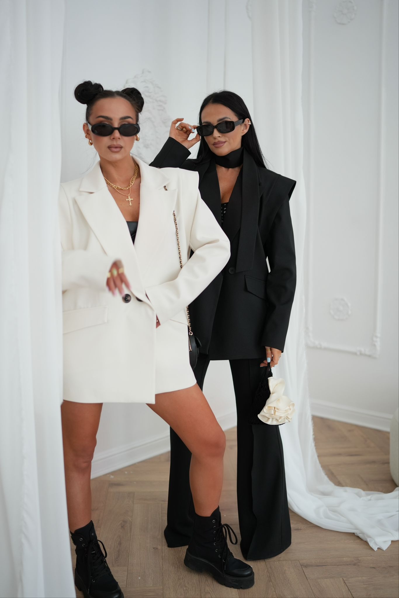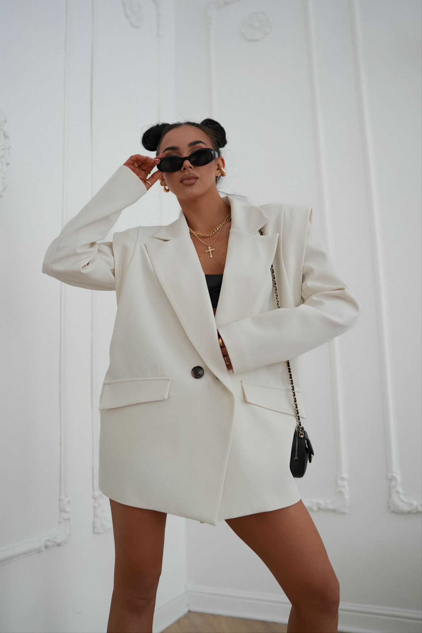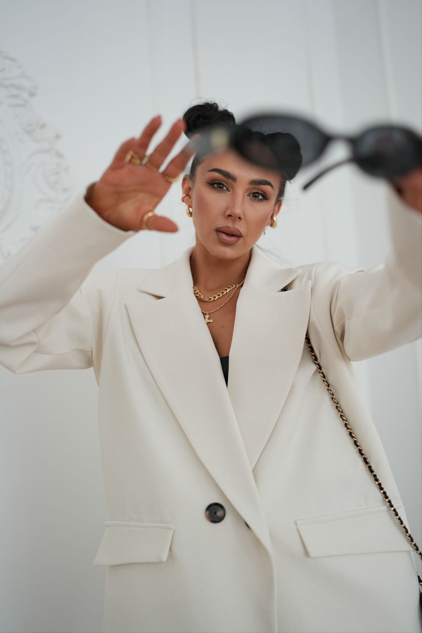 Marynarka damska Wigilia La Milla jasny beż oversize o klasycznym i prostym fasonie zapinana na guziki. Marynarka La Milla jasny beż ma uniesione ramiona i poduszki wszyte w ramionach, które świetnie modelują sylwetkę. Szeroki pasek w zestawie wykonany z tego samego materiału. Marynarka La Milla Wigilia to najmodniejszy model sezonu. Marynarka La milla wykonana jest z najwyższą starannością o detale. Posiada podszewkę.