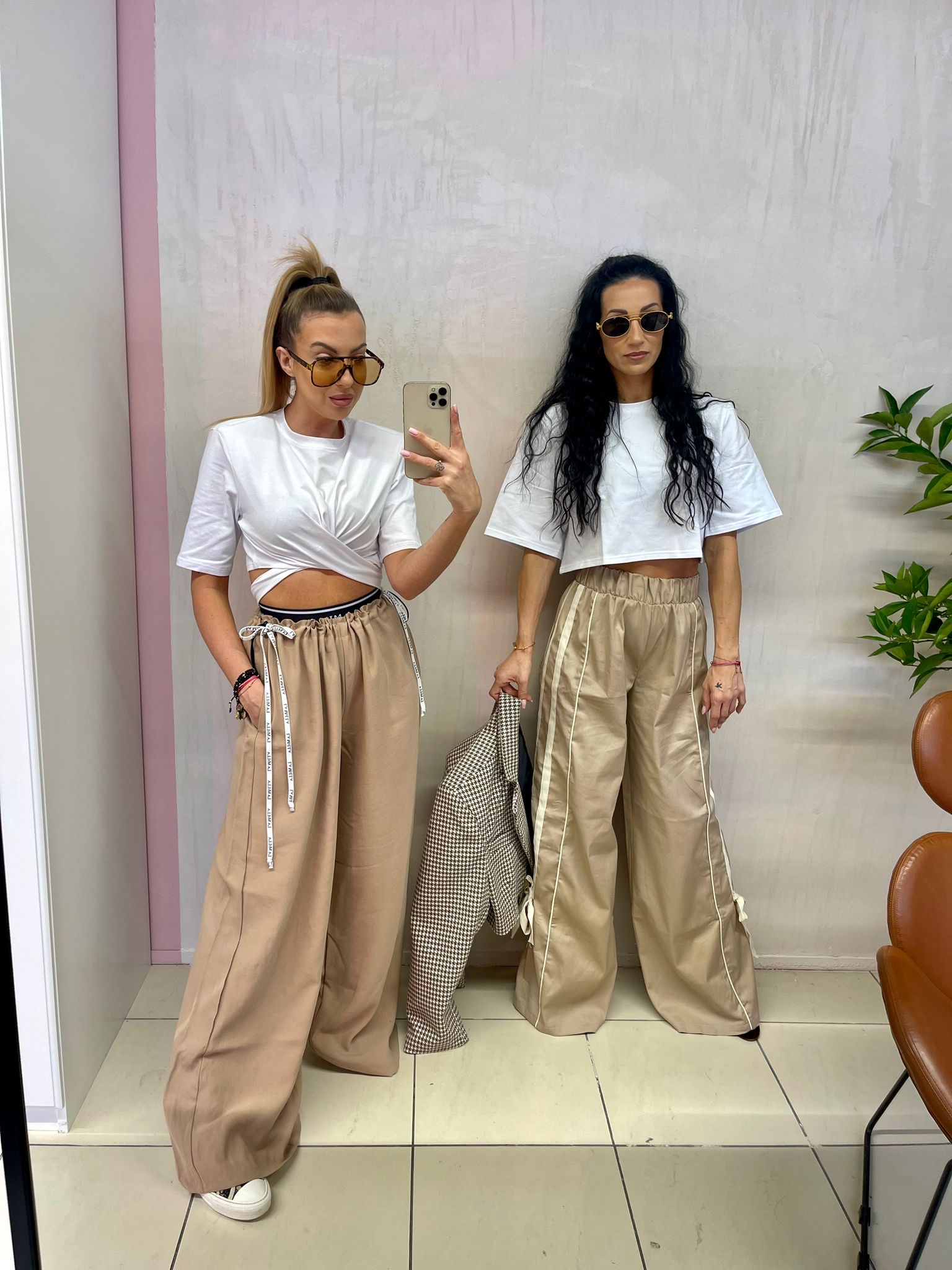 Szerokie beżowe spodnie z lampasami to kwintesencja miejskiego luzu połączonego z nutą elegancji.