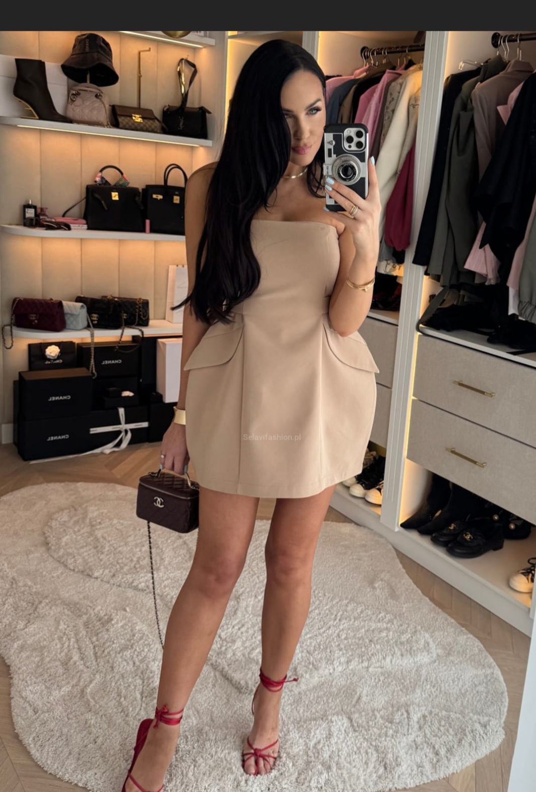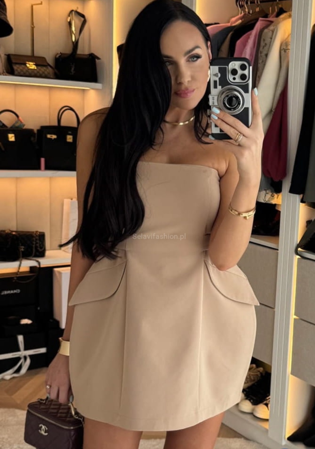 Sukienka polskiej firmy LaMilla w stylu gorsetowym, z lekko tulipanowym dołem ozdobionym patkami. Z tyłu zapięcie na ukryty suwak i wiązanie materiałowym paskiem.