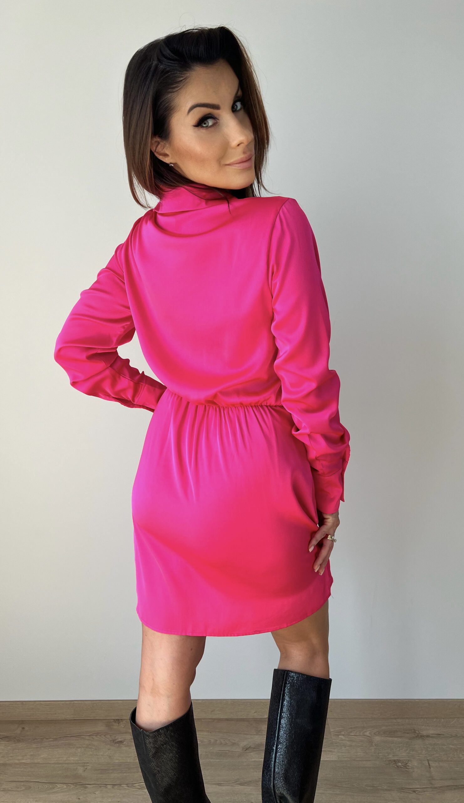 Wyjątkowa sukienka w kolorze sezonu róż i już. Sukienka wyróżnia się wyjątkowym wiązaniem z przodu. Z tyłu w pasie jest gumeczka.