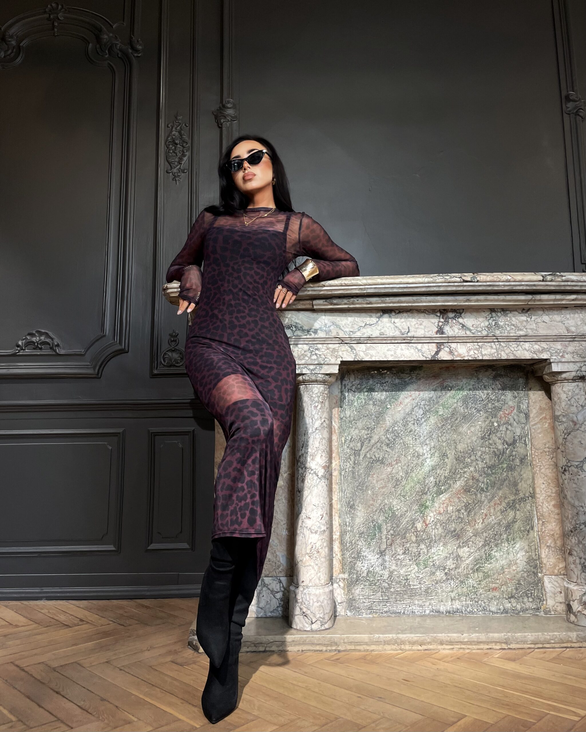 Burgundowa siateczkowa sukienka maxi w panterkę to odważna, a zarazem elegancka propozycja dla miłośniczek nietuzinkowych stylizacji. Dopasowany krój z transparentnymi rękawami i efektownym wzorem w panterkę podkreśla sylwetkę, dodając jej drapieżnego charakteru. Długość maxi oraz półprzezroczysty dół tworzą ciekawy, zmysłowy efekt, idealny na wieczorne wyjścia czy imprezy